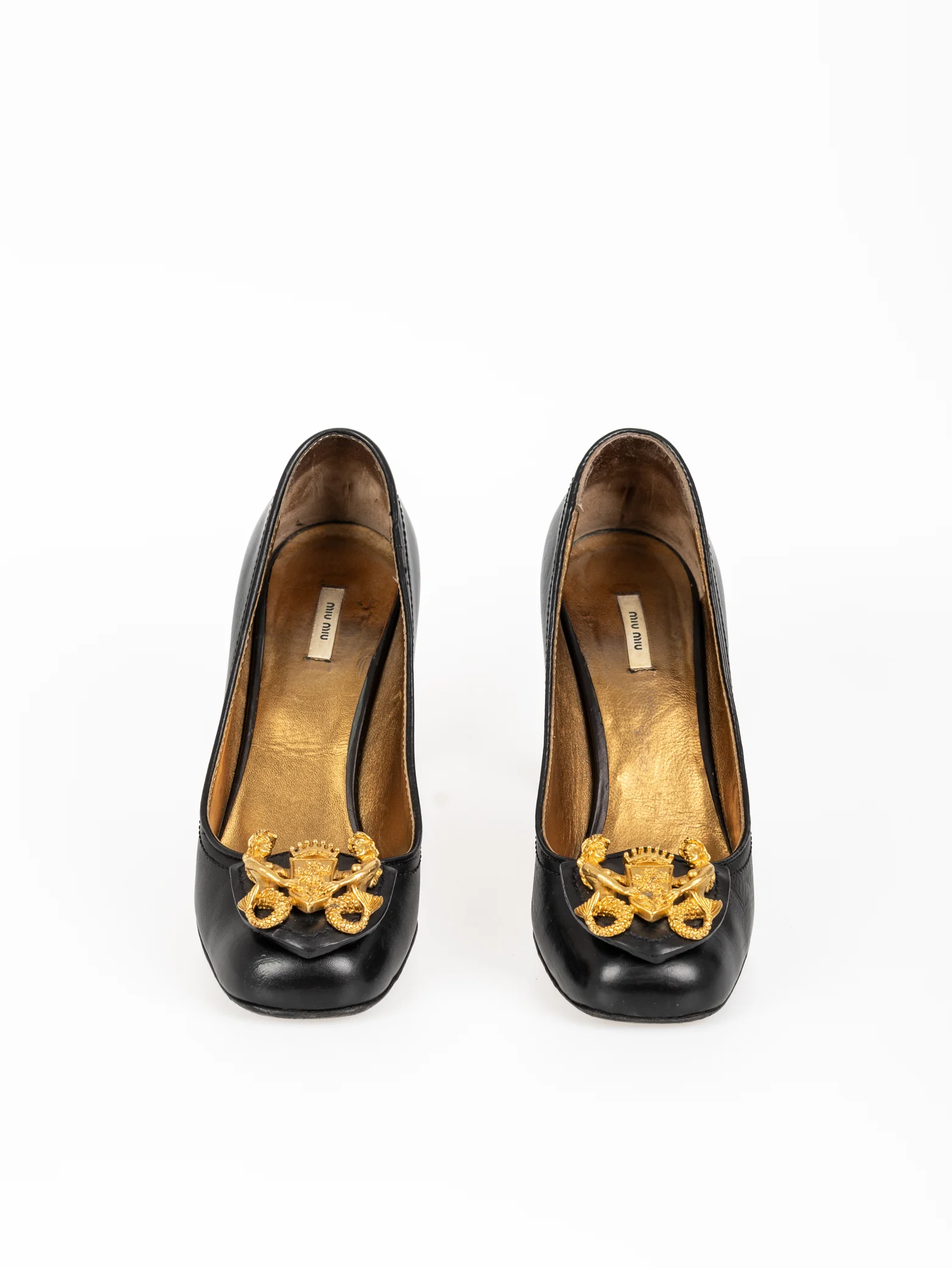 Sapato Miu Miu preto c/ sereias em hardware dourado