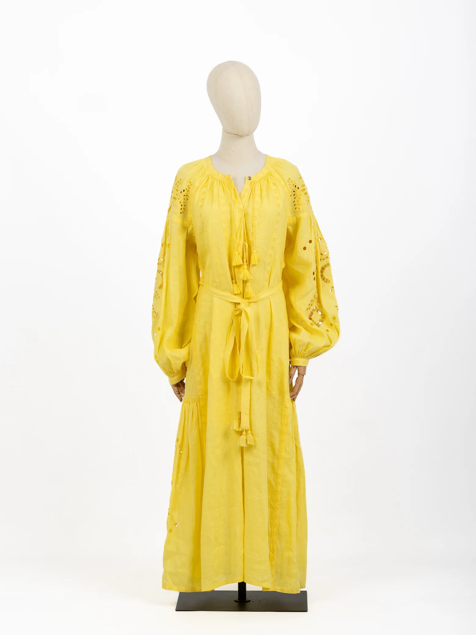 Vita Kin Vestido comprido c/ mangas em balão amarelo e bordado ingles - linho